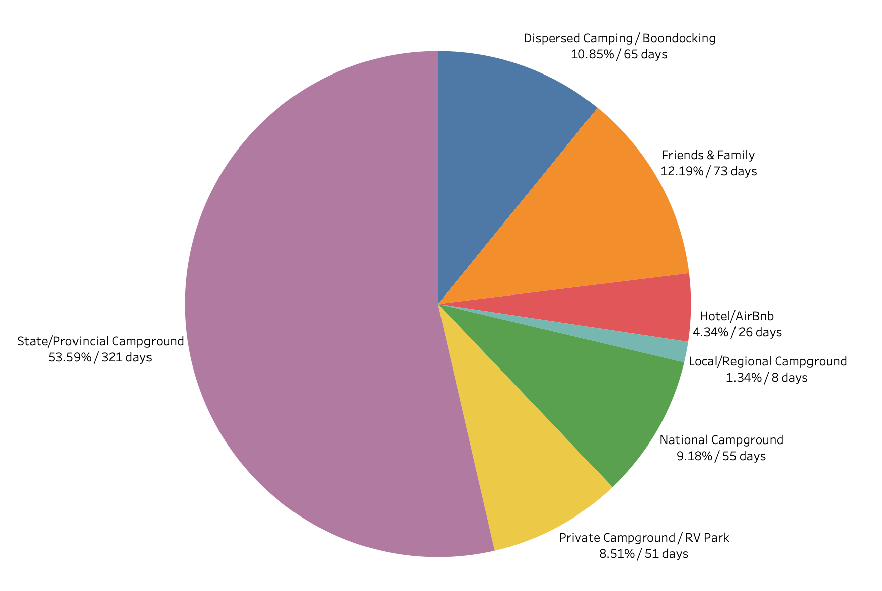 There were several different types of accommodations we used along the way, and the chart below shows how many total nights we stayed at each.