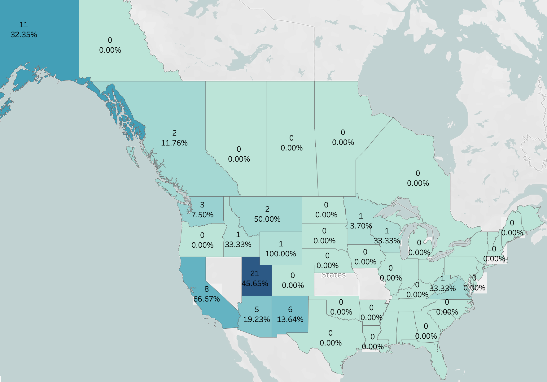 One further note on dispersed camping is that its availability and attractiveness really depended on the part of the country we were in. The map here shows how many nights we did dispersed camping in each state, and what percentage that was of our total nights. As you can see, we chose this option much more in the western half of the US: Utah, Alaska, California, New Mexico, and Arizona. These were states where we found truly mangnificant remote places to park for the night.